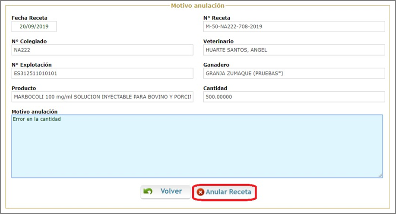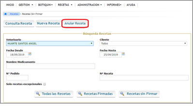 El veterinario seleccionará la receta y se procederá a su completa anulación pulsando en Anular receta (Figura.6).
