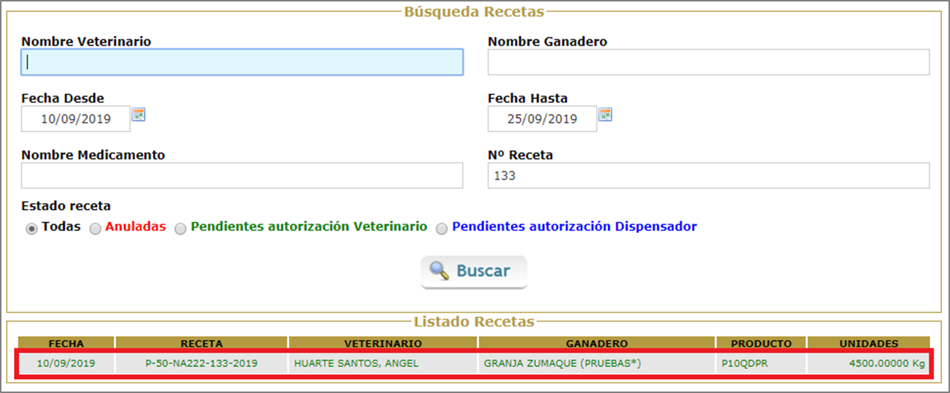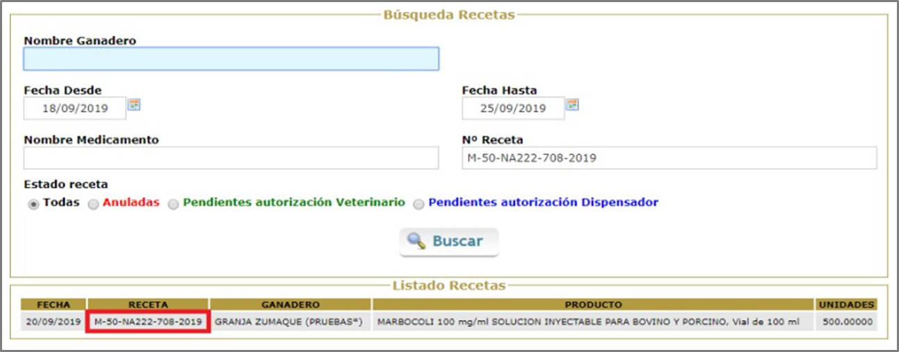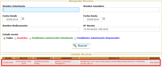 Seguidamente, el veterinario es el que tiene que autorizar a anular la receta completamente. En esta ocasión la línea de texto de la receta aparecerá en verde (Figura.5).