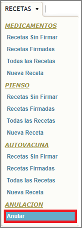 Seleccionamos Recetas/Anular (Figura.1) o el botón de Anular receta (Figura.2)