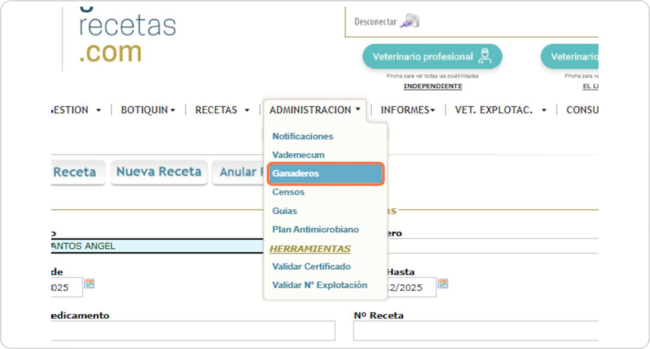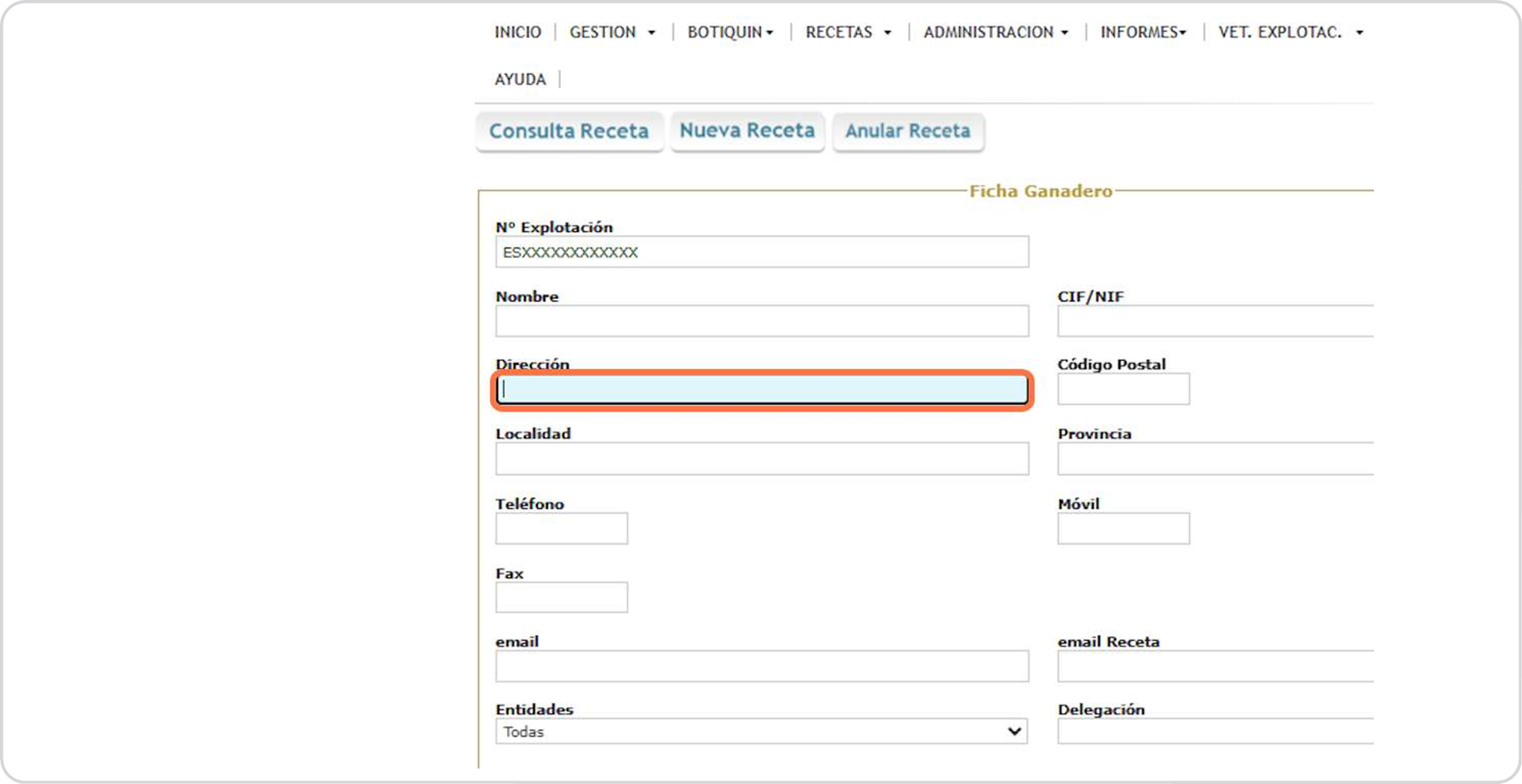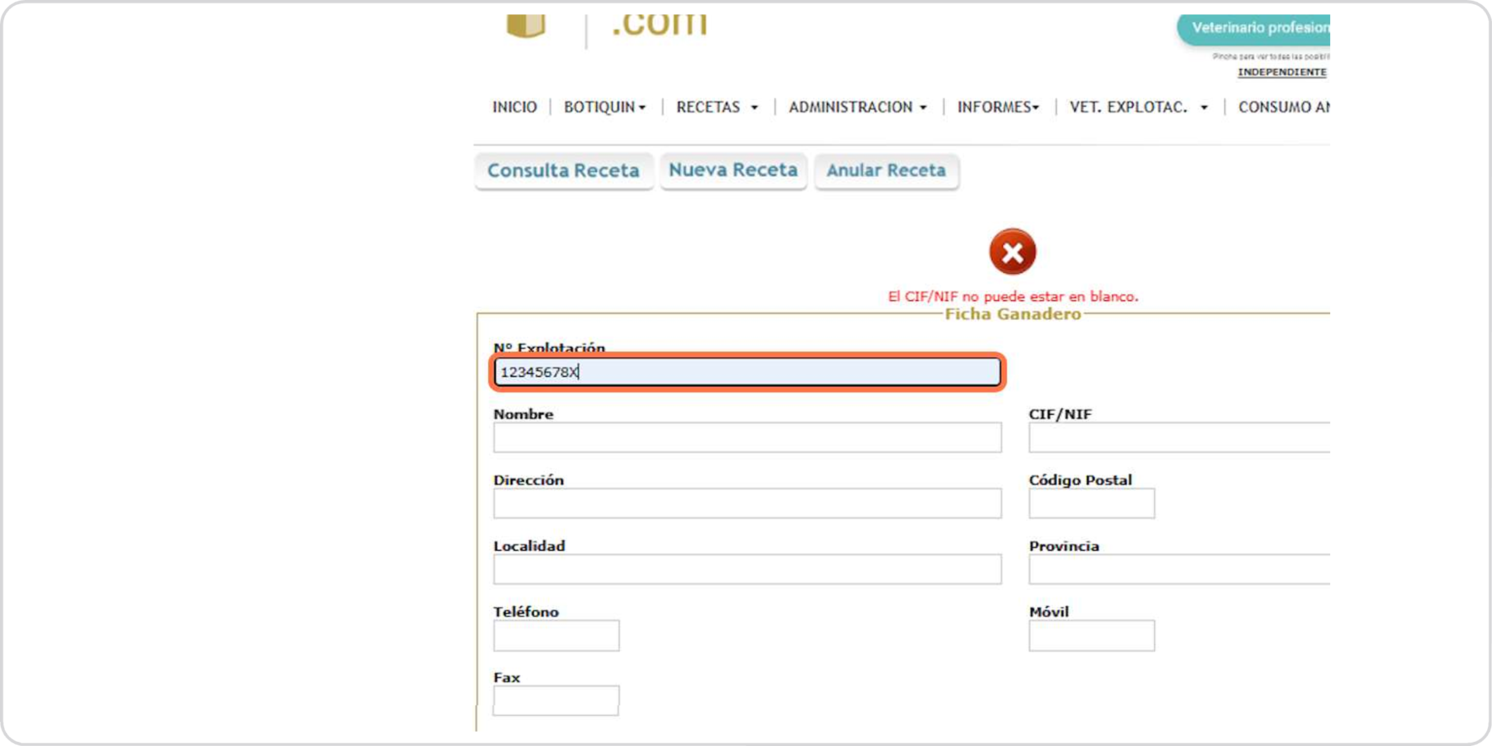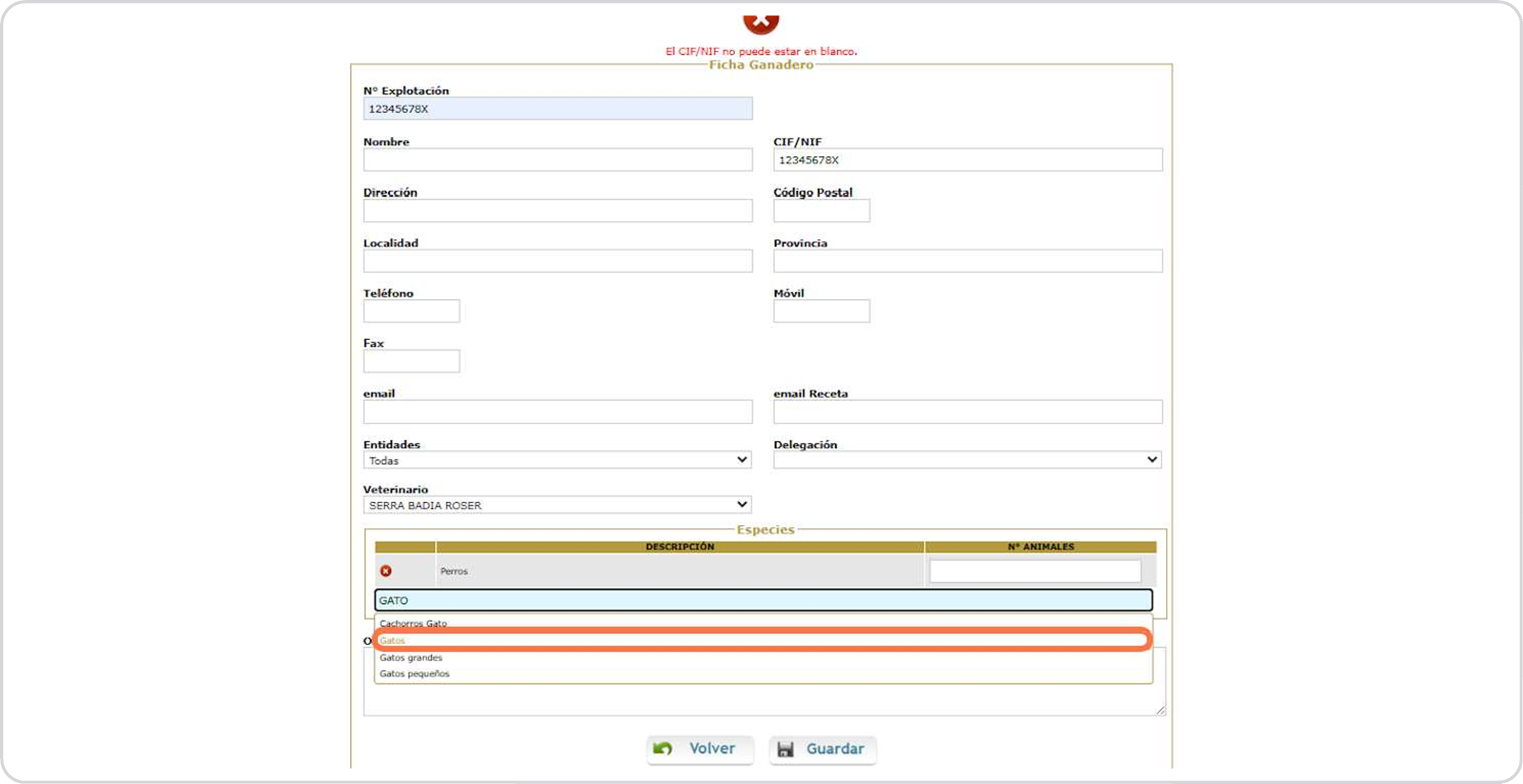Escribimos el nombre de la granja o nombre y apellidos del titular si se trata de pequeño animal