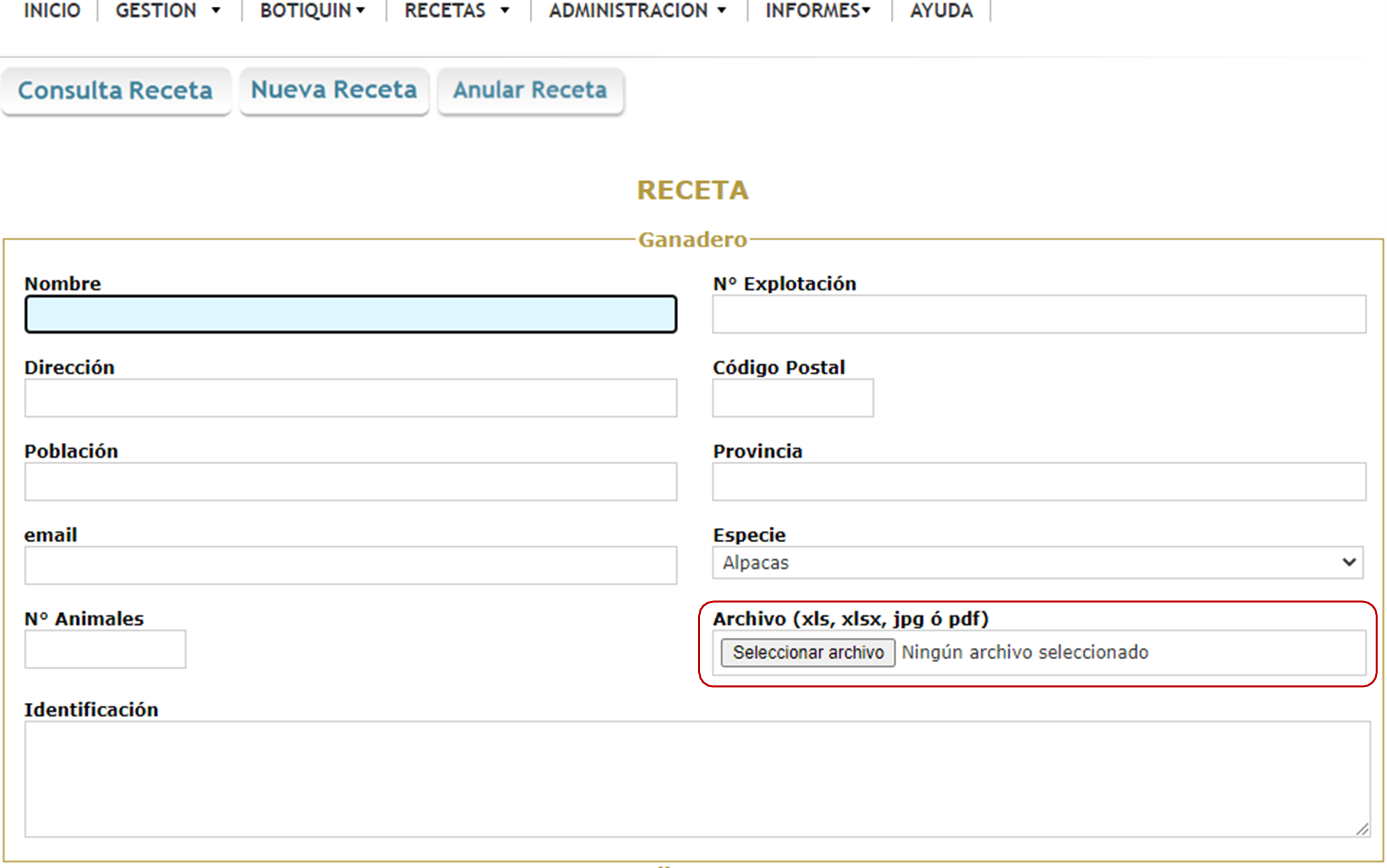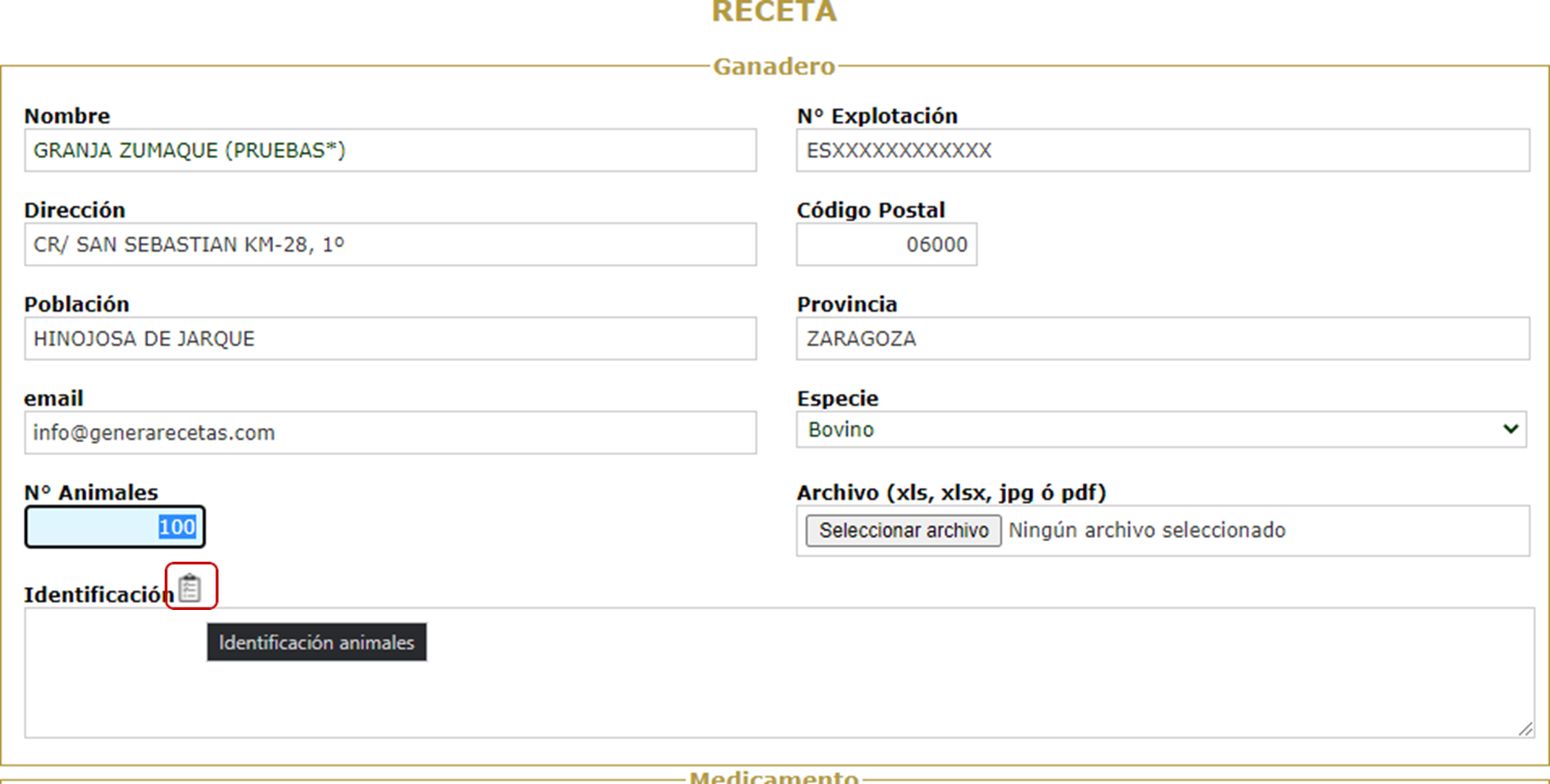 Para cargar la identificación de los animales mediante un archivo excel, debe entrar en nueva receta o edición de receta y en la parte correspondiente al ganadero, podrá seleccionar el archivo Excel que quiere subir.