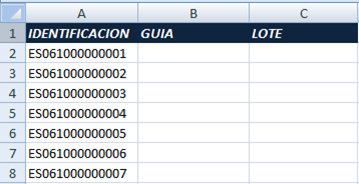 El formato del archivo Excel debe tener una fila de encabezado y al menos 3 columnas para la identificación del animal, la guía y el lote o crianza. La guía y el lote o crianza pueden estar en vacíos.