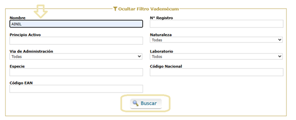 Empezaremos a escribir el medicamento al que queremos asociar los días de tratamiento y le daremos a buscar